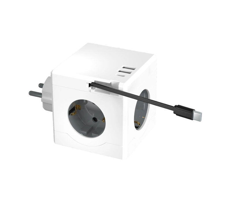 E15-D Plug-in Cube Power Strip with 3 European-Style Outlets, 2 USB-A Ports, and 1 USB-C Port, Featuring a Retractable Charging Cable
